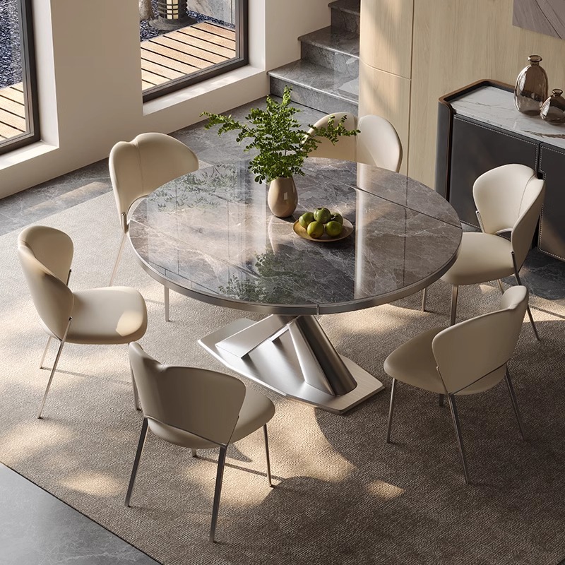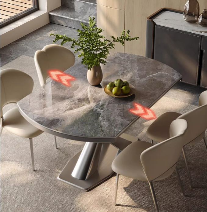 Mặt bàn bằng đá ceramic dày dặn, cứng cao, chịu nhiệt, chống thấm, không phai màu, dễ vệ sinh. Chân bàn thép carbon ổn định, chắc chắn, chịu lực cực tốt.