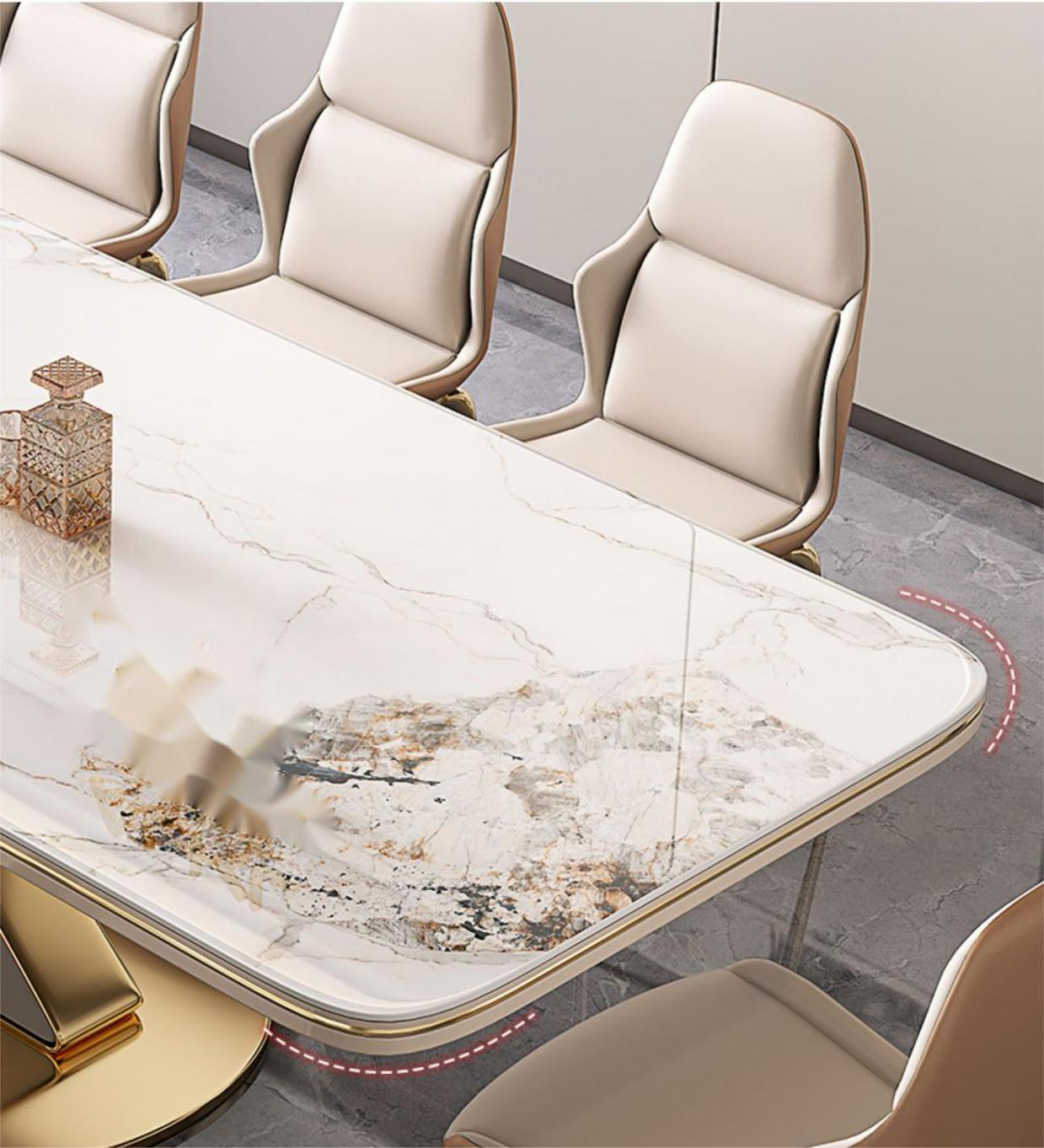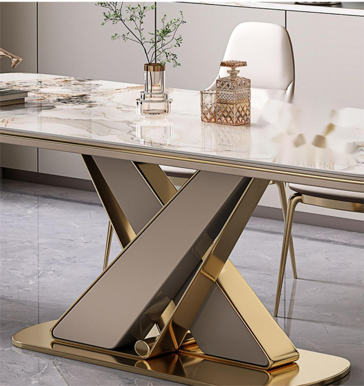 Phần khung chân trụ của bàn được thiết kế theo dáng chữ X cực sang trọng & phá cách, khiến tổng thể chiếc bàn trông thật cá tính đồng thời trở thành điểm nhấn mới lạ làm bừng sáng cả không gian. Khung chân này làm bằng inox mạ vàng chuẩn 304, chắc chắn, bóng sáng, thu hút mọi ánh nhìn.