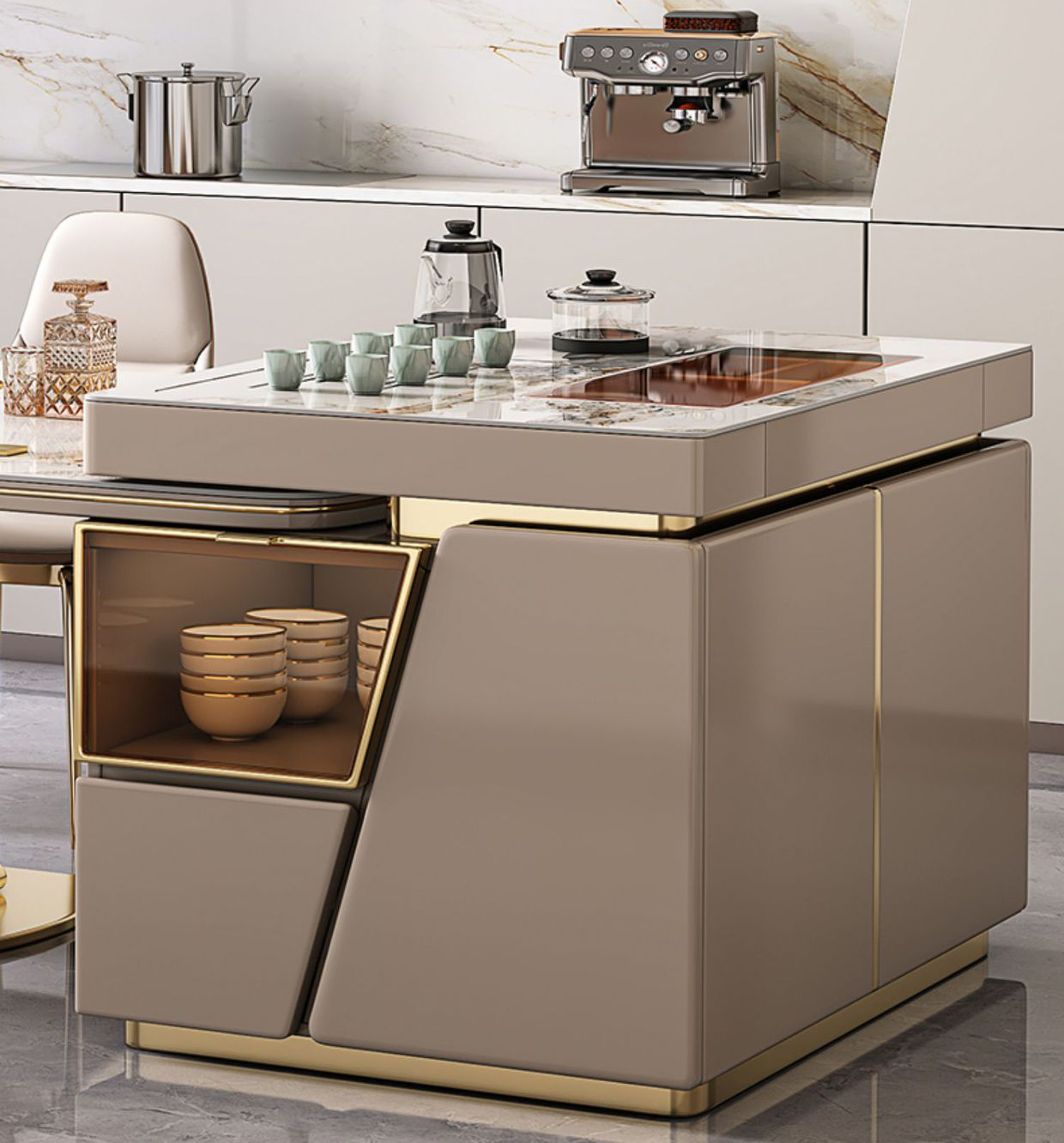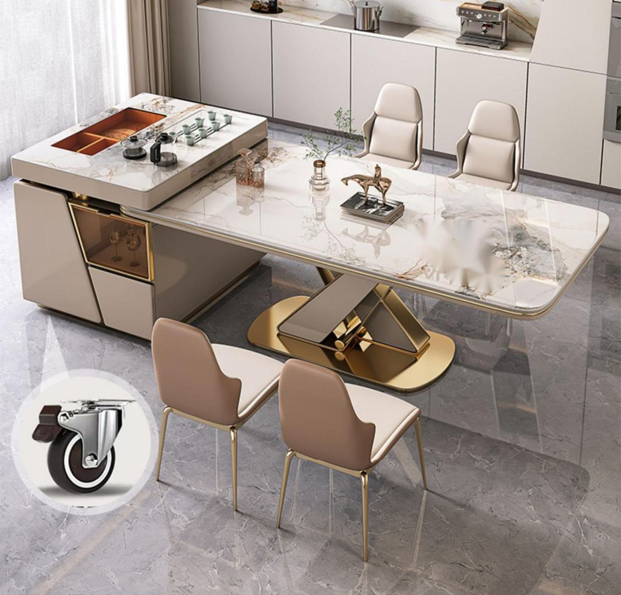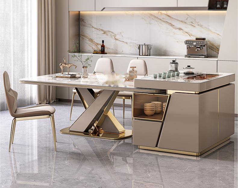 BỘ BÀN ĂN KẾT HỢP BÀN ĐẢO thiết kế độc đáo mang tính thời đại. Mặt bàn đá ceramic, khung chân trụ chữ X inox mạ vàng chuẩn 304. Trang bị hệ thống khay pha trà tự động. Có ngăn tủ chứa đồ rộng rãi. Tự do chuyển đổi đảo bếp sang bên trái và bên phải hoặc tách rời.