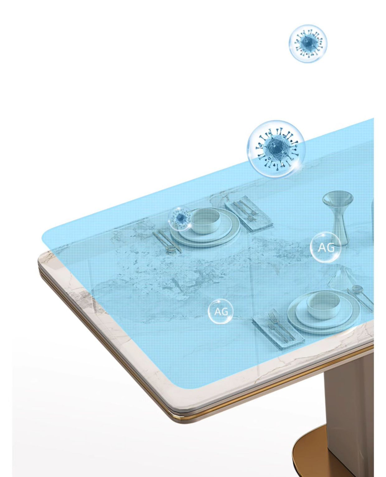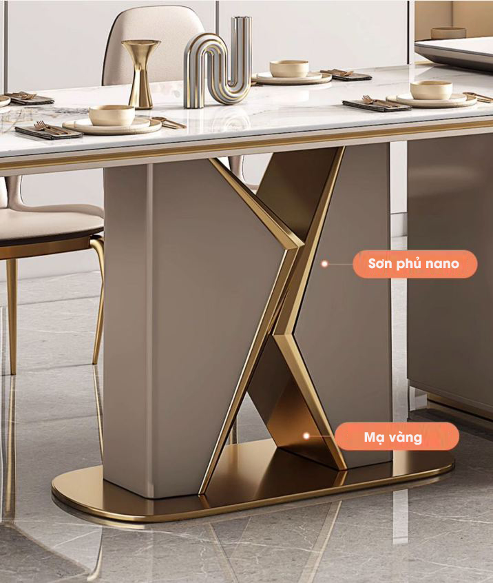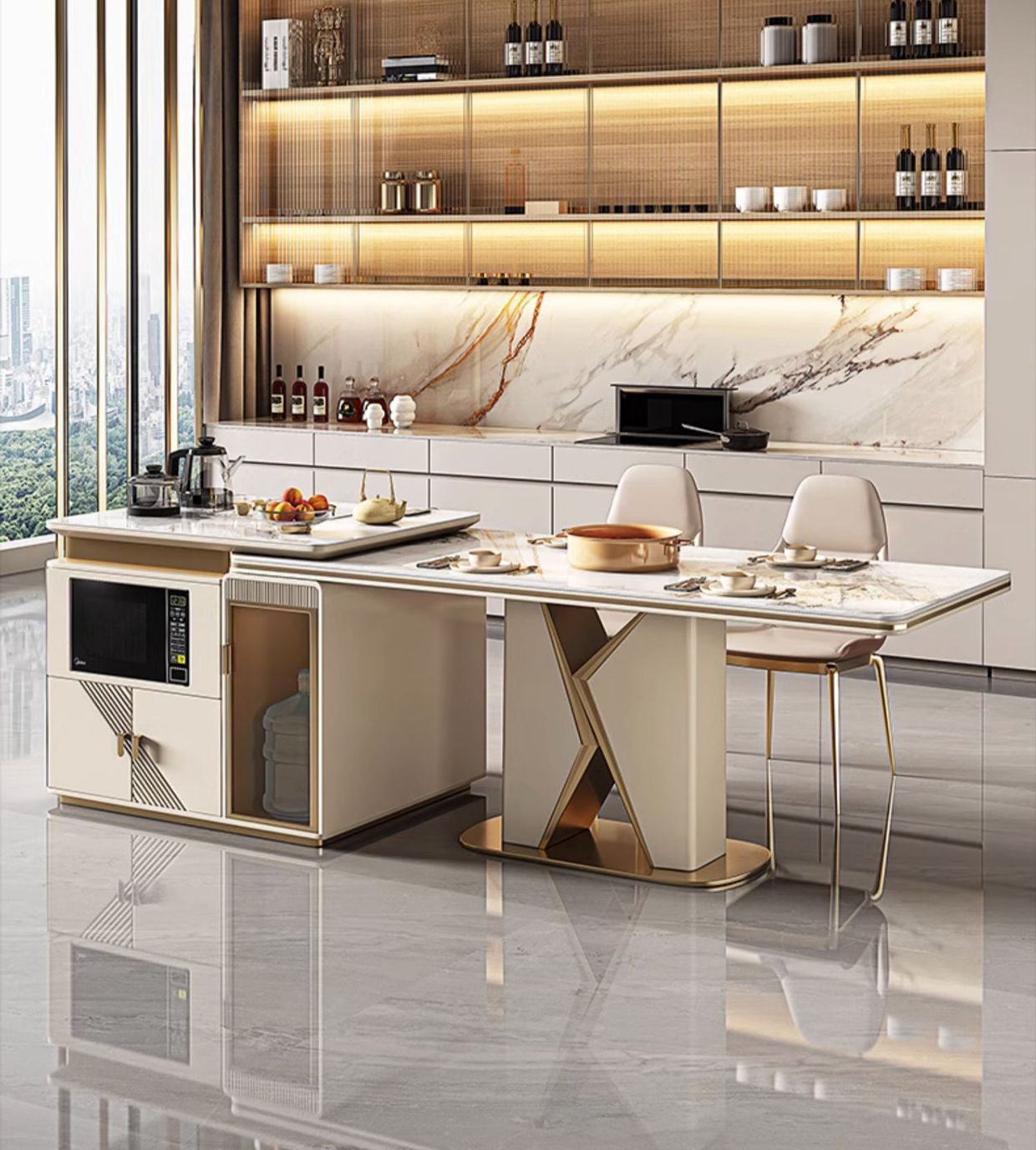 BỘ BÀN ĂN KẾT HỢP BÀN ĐẢO mặt bàn đá bóng kháng khuẩn nhập khẩu Ý. Chân trụ và tủ gỗ ván dán plywood, phủ sơn công nghệ nano. Chân đế inox 304 mạ vàng PVD. Trang bị bếp từ âm, máy sấy bát đũa, lò vi sóng, công cụ pha trà, tủ chứa đồ, cổng sạc usb và ổ cắm điện. Tự do chuyển đổi bàn đảo.