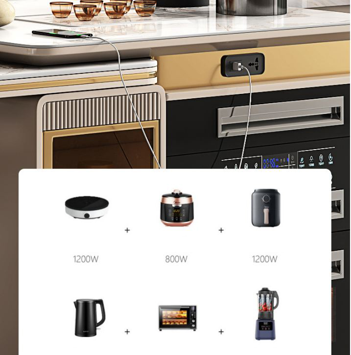 Trang bị cổng sạc usb và ổ cắm điện tiện lợi. Bàn đảo thiết kế có thể cắm dây điện âm mặt đất giúp che đường dây điện.