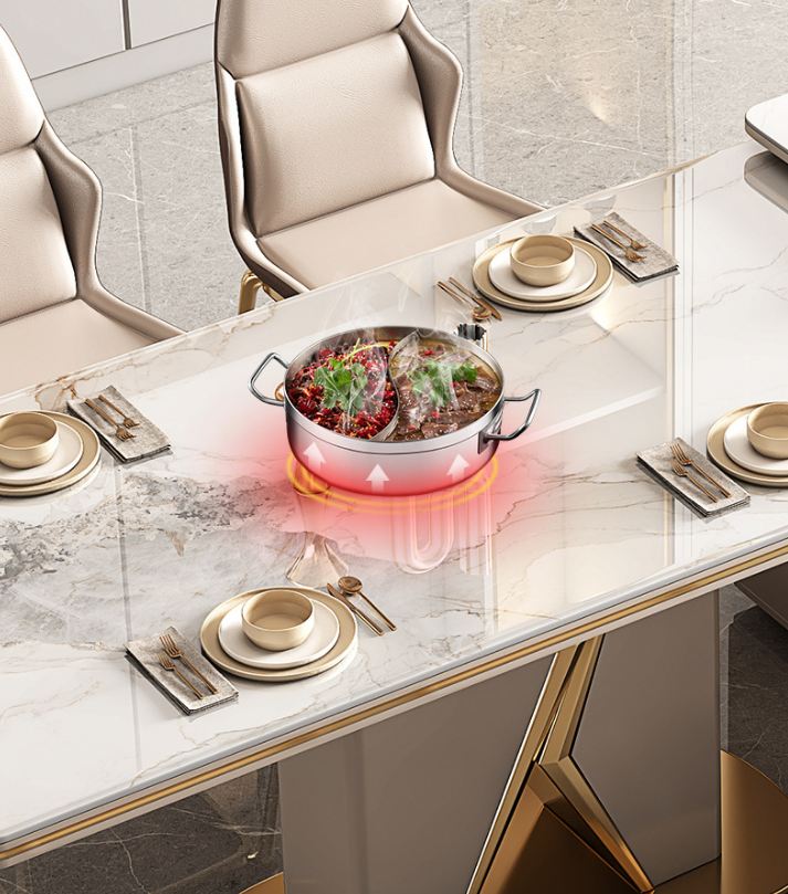 Bếp từ âm ngay chính giữa mặt bàn ăn, giúp nấu chín/làm nóng trực tiếp ngay tại bàn mà không phải đi đâu xa. Tiện lợi khi gia đình muốn ăn lẩu hoặc các món ăn cần đun nóng liên tục,...
