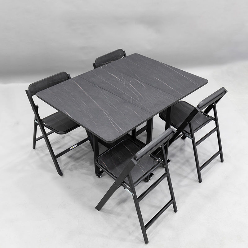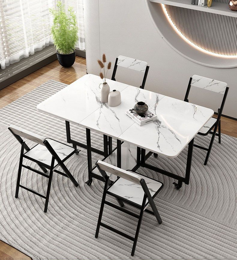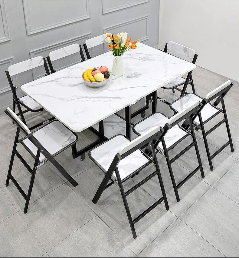 Bàn có thiết kế rất độc đáo, khi bàn gập lại, 1 khoảng không thông nhau bên dưới gầm bàn sẽ xuất hiện. Tận dụng triệt để khoảng không đó để lưu trữ ghế ngồi khi không sử dụng (có thể chứa được 4/6 chiếc ghế), giúp tiết kiệm không gian một cách tối đa.