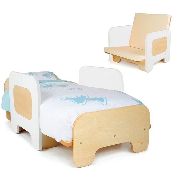 Thiết kế độc lạ dạng gấp mở phần tựa lưng, dựng lên làm ghế, ngả ra làm giường, tiện lợi cực kỳ. Sản phẩm còn trang bị rào chắn ở 2 bên, an toàn hơn cho bé mỗi khi sử dụng. Chất liệu gỗ cao cấp, đệm mút êm ái, thoải mái - thư giãn khi nằm.