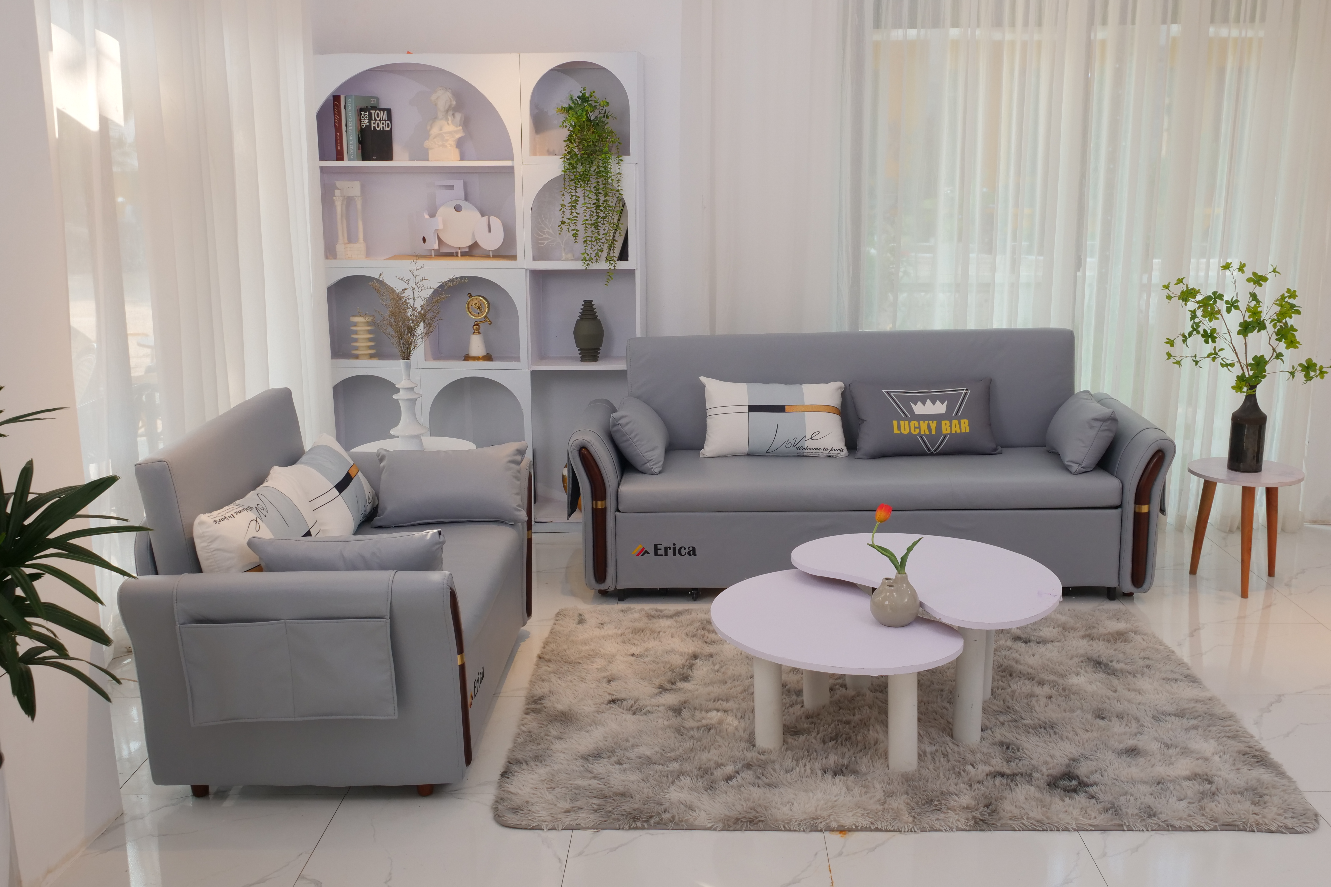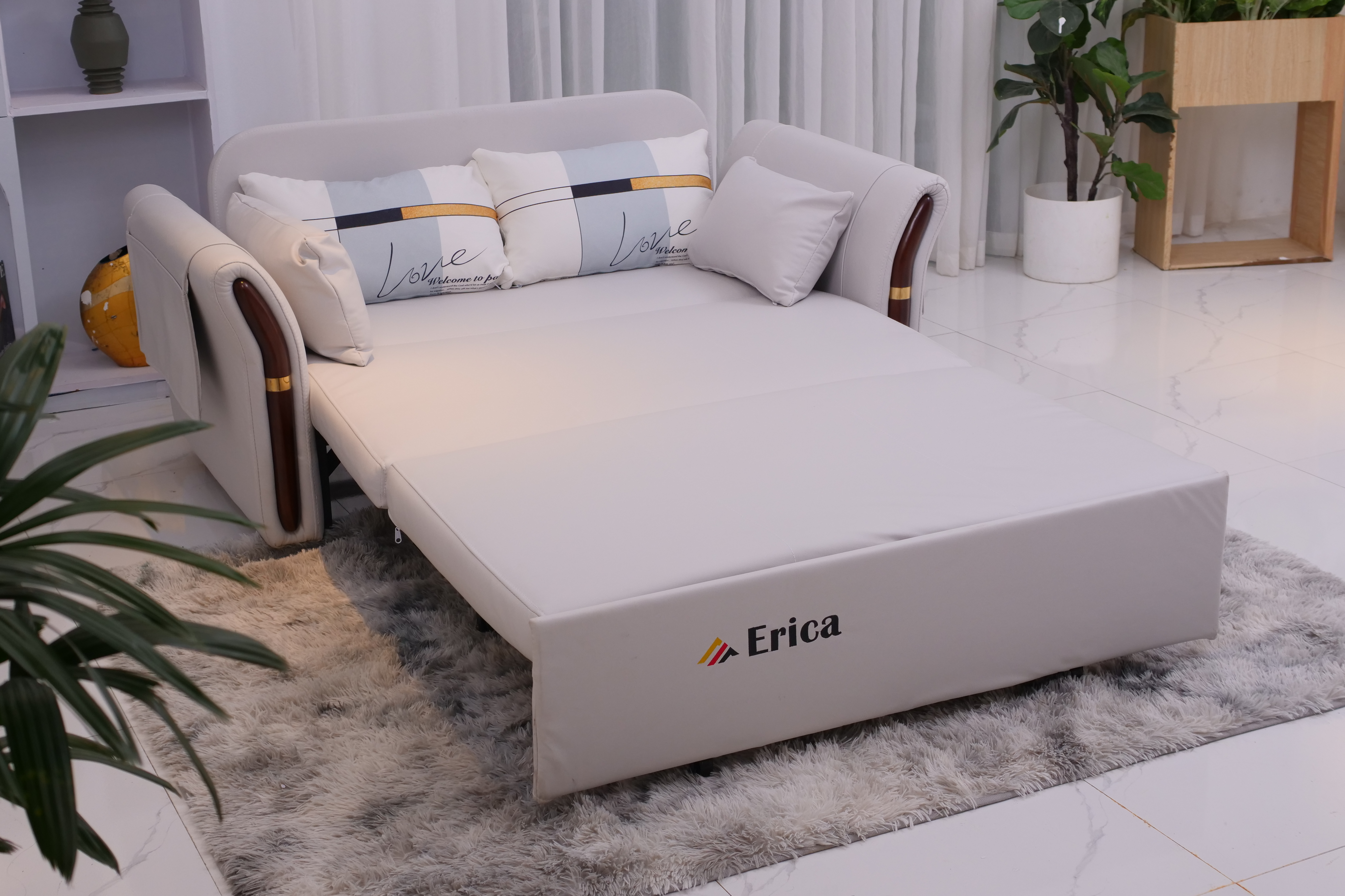 Sản phẩm nằm trong BST những chiếc sofa bed gỗ được yêu thích nhất của nhà Erica. Sở hữu ngoại hình thời thượng có tay vịn bằng gỗ cao su nguyên khối; đệm sofa là đệm cao su kết hợp bọt biển, bên ngoài bọc vải hóa học; chuyển đổi công năng ghế giường – giường ghế linh hoạt, bên dưới mặt đệm có ngăn chứa đồ;… Tất cả điều này chắc chắn sẽ chinh phục được cô.