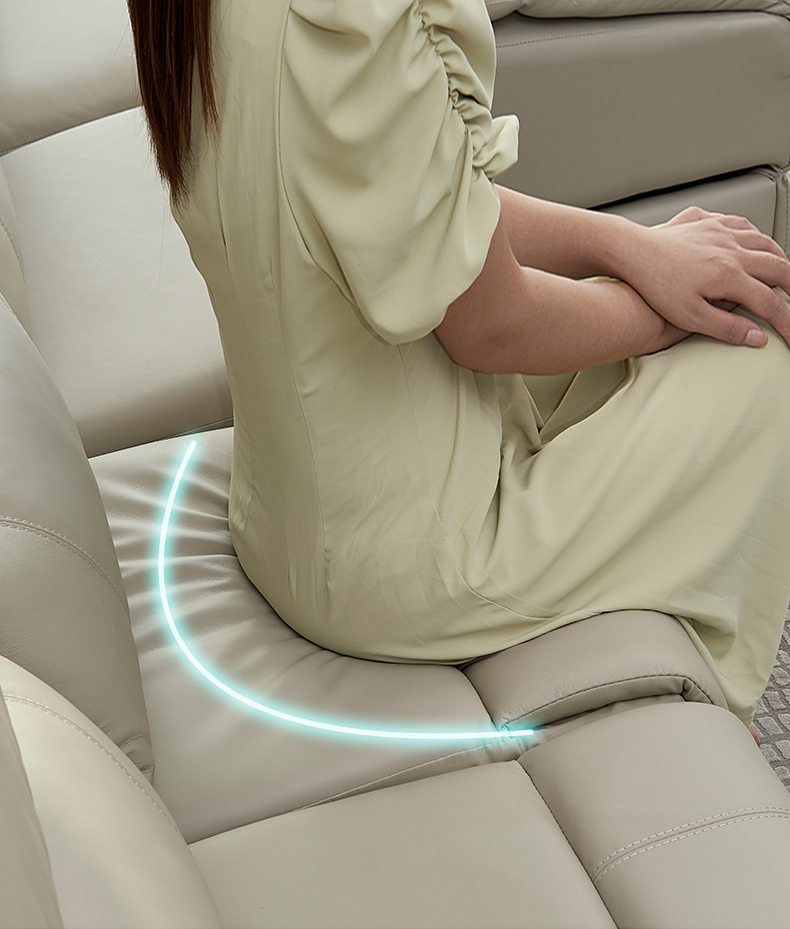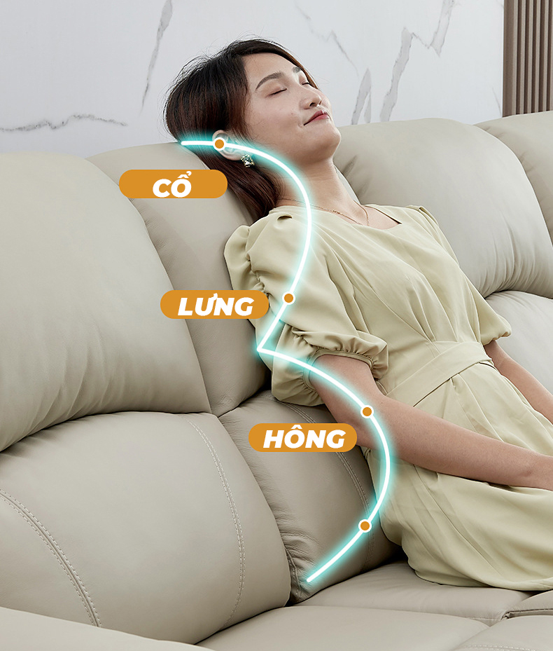 Dựa trên nguyên lý công thái học, ghế sofa được thiết kế để nâng đỡ cơ thể một cách khoa học. Tựa đầu có thể điều chỉnh linh hoạt, lưng ghế và tay vịn ôm sát đường cong tự nhiên, kết hợp cùng phần đệm ngồi dày dặn và sâu rộng, mang đến cảm giác thư giãn tối đa ở mọi tư thế.
