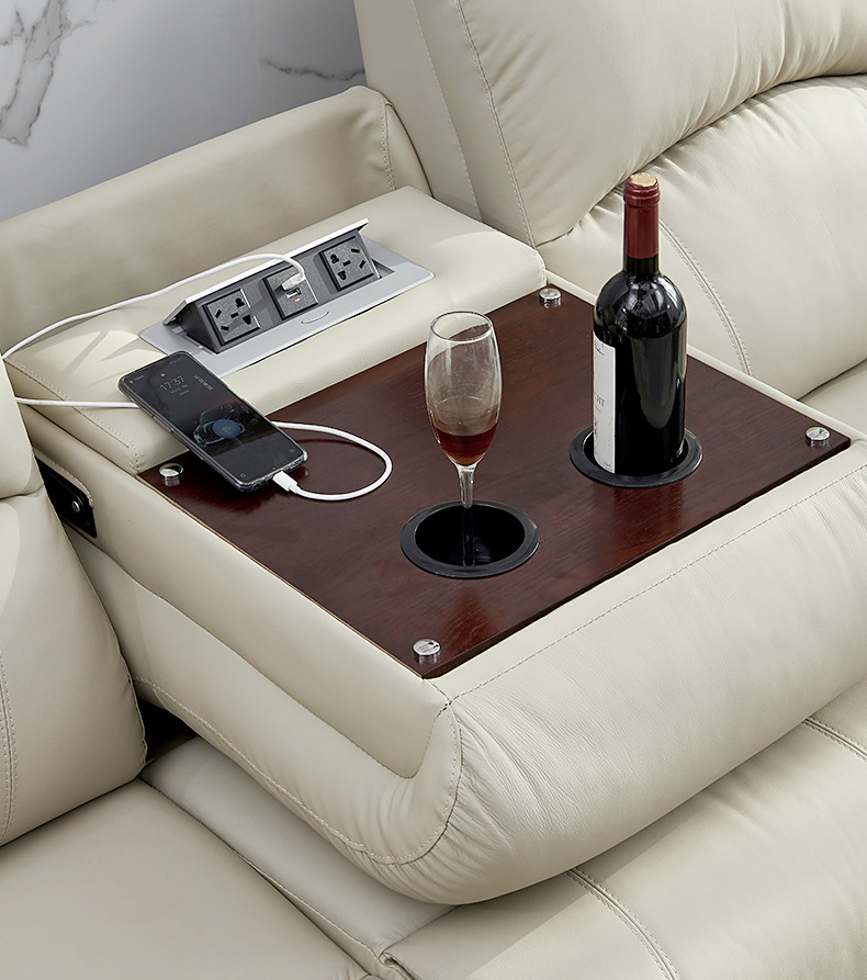 Không còn lo gián đoạn trong lúc nghỉ ngơi, sofa tích hợp sẵn ổ cắm điện và cổng USB, cho phép người dùng vừa sạc thiết bị vừa xem phim, làm việc hay giải trí ngay tại chỗ.