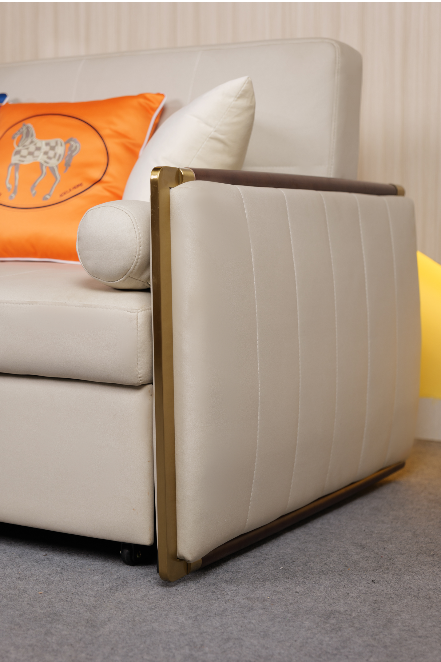 Có thể nói, chi tiết mạ vàng lấp lánh luôn là nét đặc trưng dễ thấy nhất của nội thất phong cách Ý. Và với Giường Sofa Thông Minh Cao Cấp ERICA - LX6, chi tiết này hiện diện ở phần tay vịn. Chất liệu gỗ & thép carbon phun titan màu vàng được lồng ghép một cách tinh tế, tạo nên một khung tay vịn thanh lịch và có tính thẩm mỹ cao. Màu nâu của gỗ cùng màu vàng óng ánh của thép mạ màu kết hợp với những ánh đèn huyền ảo, sẽ đem lại một không gian sống mỹ miều hơn bao giờ hết.