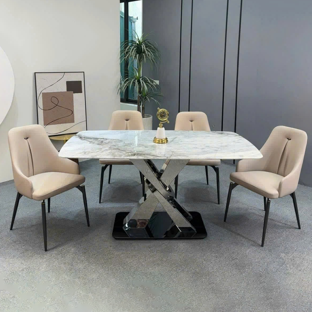 Bộ bàn ăn này mang phong cách châu Âu hiện đại với các đường nét tinh xảo và màu sắc trang nhã. Mặt bàn đá với hoa văn vân mây tự nhiên nổi bật, không chỉ làm tăng thêm vẻ sang trọng mà còn thể hiện gu thẩm mỹ tinh tế của gia chủ. Thiết kế chân bàn hình chữ X hiện đại và độc đáo, bằng inox mạ crom sáng bóng, không chỉ mang đến sự chắc chắn mà còn tạo điểm nhấn thẩm mỹ cho cả bộ bàn.