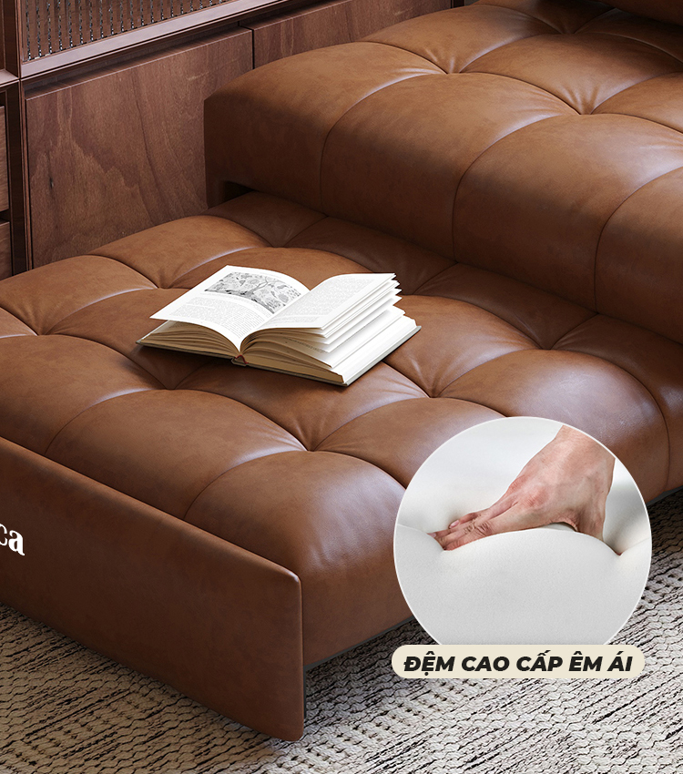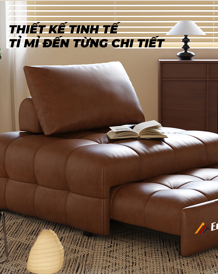 Được ứng dụng công nghệ ép viền cùng tạo nút rút độc đáo, sofa giường trở nên chắc chắn và bền bỉ hơn. Các đường may đều đặn, sắc sảo, thể hiện sự chỉn chu trong từng chi tiết. Mỗi mũi kim không chỉ là kỹ thuật, mà còn thể hiện sự tâm huyết trong chế tác, biến sản phẩm thành một điểm nhấn nghệ thuật cho không gian nội thất.