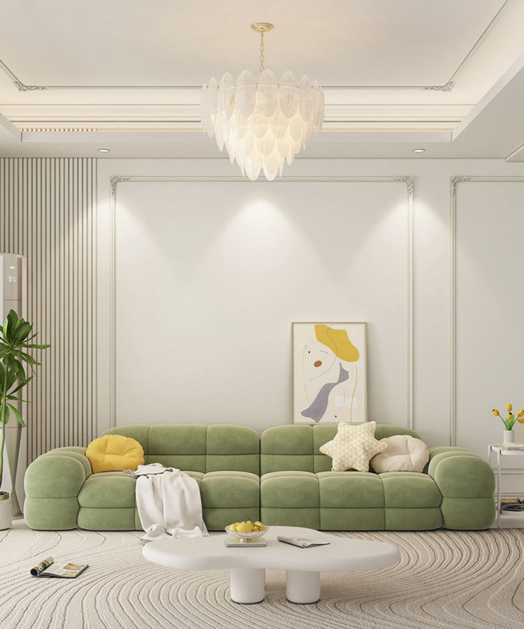 ERICA – NS33 gây ấn tượng bởi kiểu dáng sáng tạo, lấy cảm hứng từ những khối vuông mềm mại như viên kẹo marshmallow. Thiết kế độc đáo này vừa mang đến sự sang trọng – thanh lịch, vừa gợi cảm giác ấm áp, gần gũi và ngọt ngào cho không gian phòng khách.