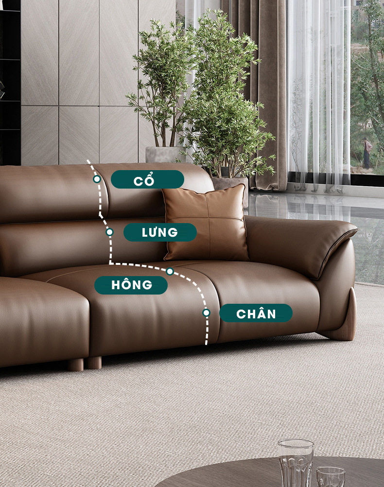 Không cần cầu kỳ hay rườm rà, sofa tạo dấu ấn riêng bằng những đường nét mềm mại, thanh thoát. Phần tựa lưng, mặt ghế và tay vịn được thiết kế liền mạch – uốn lượn nhẹ nhàng, tạo nên tổng thể duyên dáng mà vẫn vững chãi. Tựa lưng thấp và đệm dày dặn giúp chiếc sofa mang hơi hướng của những mẫu lounge hiện đại – lý tưởng cho những ai yêu thích sự thư giãn đầy phong cách.