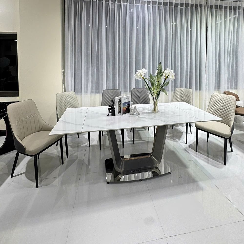 Lấy cảm hứng từ phong cách nội thất Ý, bộ bàn ăn mặt đá ERICA – DP04 nổi bật với thiết kế hiện đại, tối ưu về công năng & trang nhã về hình thức. Mặt bàn có độ cứng vượt trội cùng khả năng chịu nhiệt tốt và dễ dàng lau chùi khi bị bám bẩn. Ngoài ra, đặc tính chống thấm của đá ceramic cũng giúp bàn giữ được vẻ đẹp như mới sau thời gian dài sử dụng, đồng thời ngăn ngừa sự xâm nhập của vi khuẩn, đảm bảo an toàn vệ sinh. Mặt bàn còn có thể mở rộng 2 đầu, giúp gia chủ dễ dàng thay đổi kích thước bàn tùy theo nhu cầu sử dụng. Phần chân bàn hình chữ V, nhằm đem lại sự vững chãi và cảm giác cân đối cho tổng thể sản phẩm. Thiết kế kiểu này vừa là điểm nhấn thẩm mỹ vừa giúp bàn có độ ổn định cao, không bị rung lắc khi sử dụng.
